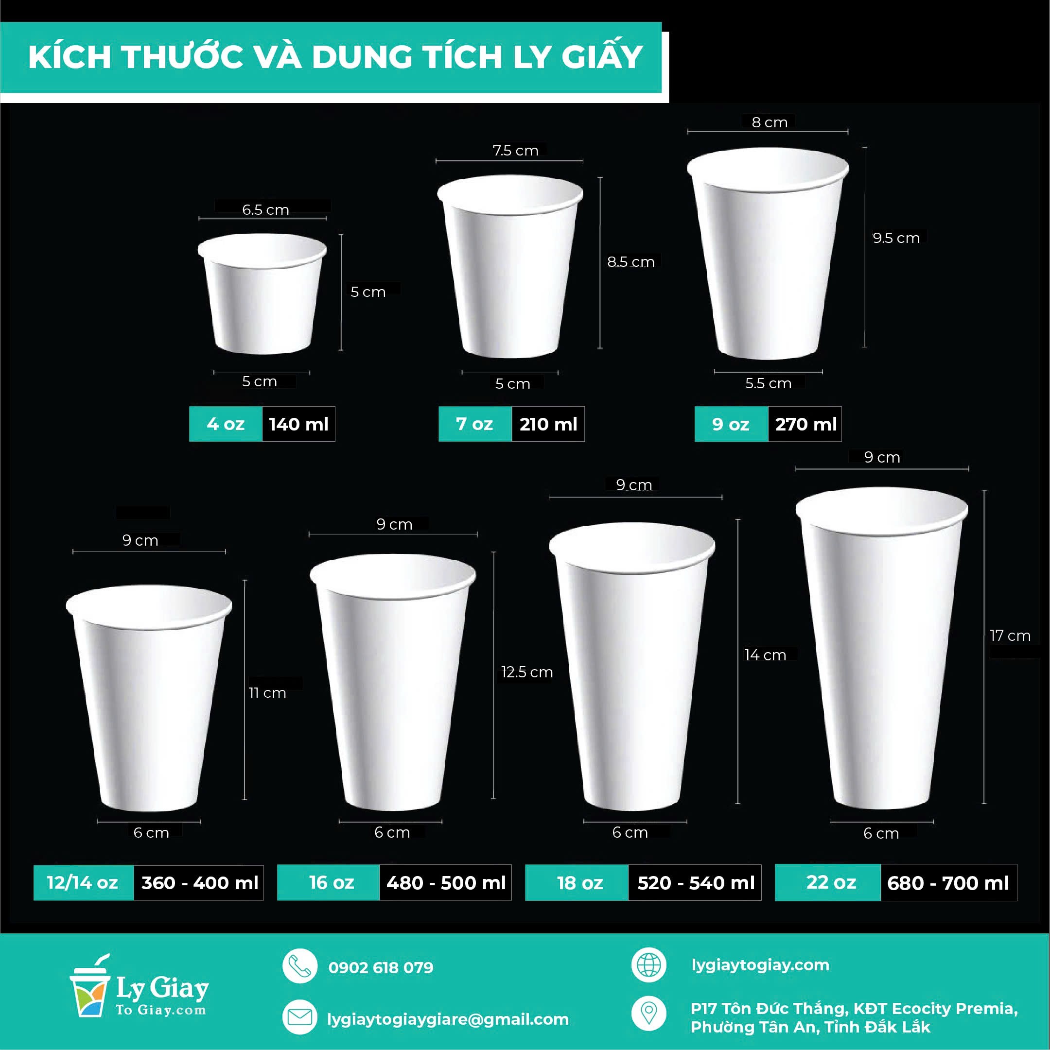 - 16oz (480ml): Latte, Cafe đá, ly giấy cafe mang đi phổ biến nhất